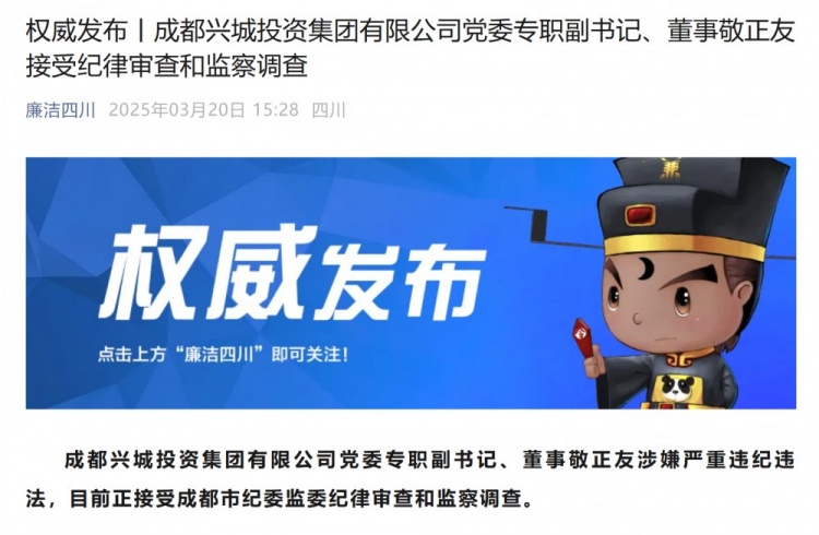 3月20日訊 根據(jù)“廉潔四川”公眾號(hào)消息,成都興城投資集團(tuán)有限公司黨委專(zhuān)職副書(shū)記、董事敬正友接受紀(jì)律審查和監(jiān)察調(diào)查。