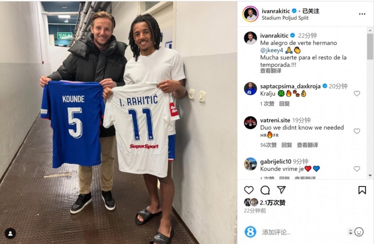 目前效力于哈伊杜克的拉基蒂奇社媒曬出與孔德互換球衣的照片,配文:“很高興見到你,我的兄弟孔德,祝你在本賽季余下的比賽中好運(yùn)!”