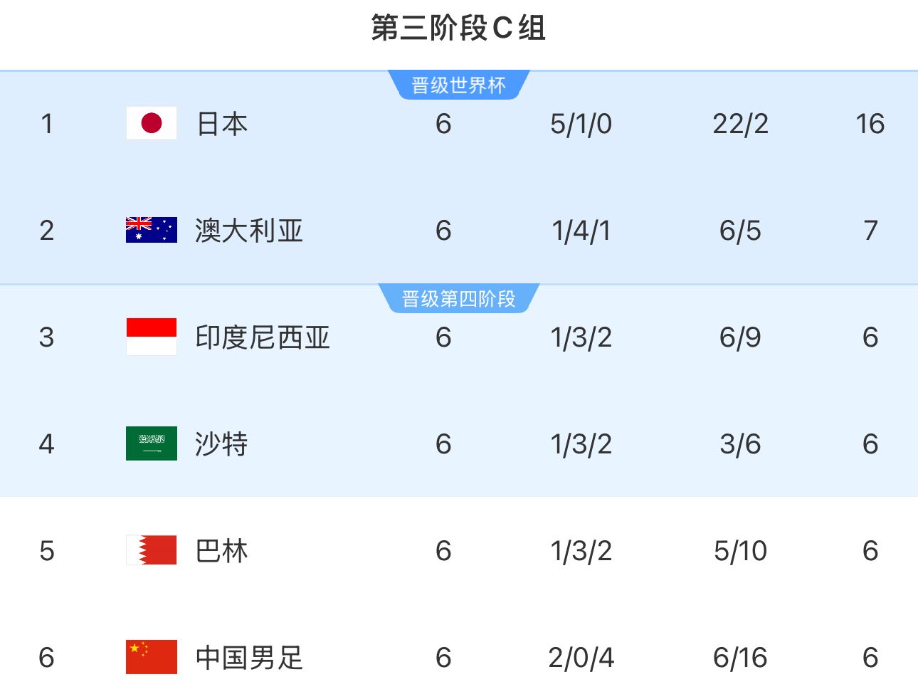 18強(qiáng)賽C組第7輪,日本2-0巴林提前3輪直通世界杯,澳大利亞5比1印尼成為本組第二個(gè)拿到10分的球隊(duì),沙特在本組最后一場(chǎng)比賽中戰(zhàn)勝中國(guó),率先拿到9分。