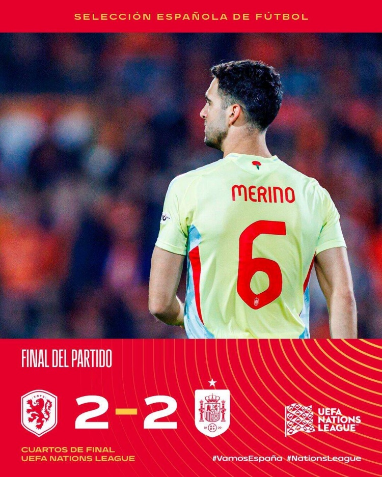梅里諾補時絕平,荷蘭2-2西班牙,西班牙歐國聯(lián)五連勝終結(jié)。