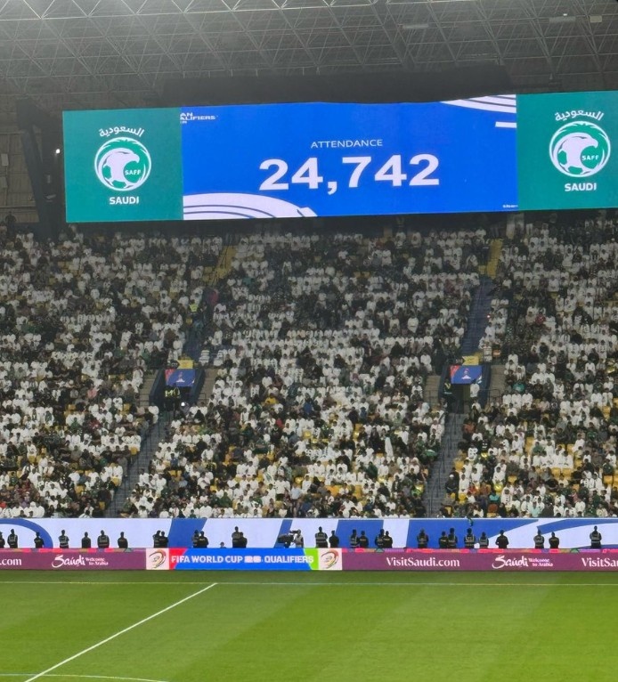 3月21日訊 世預(yù)賽亞洲區(qū)第三階段C組第7輪,國足0-1客負(fù)沙特。據(jù)現(xiàn)場大屏幕顯示,本場比賽現(xiàn)場觀眾人數(shù)為24742人。 標(biāo)簽: 足球 中國隊(duì) 中國男足 中國足球 沙特 中超