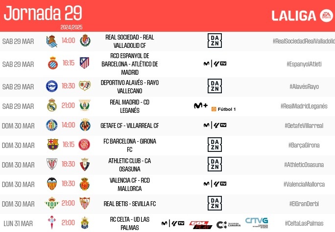 西甲第29輪賽程(以下均為北京時間)↓