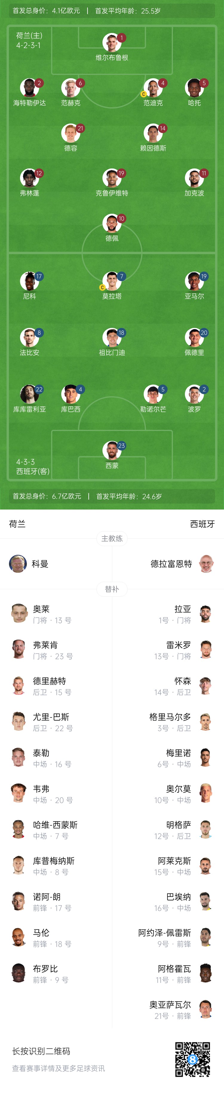 3月21日訊 北京時(shí)間03:45,歐國聯(lián)1/4賽決賽首回合,荷蘭主場迎戰(zhàn)西班牙。賽前官方公布了雙方的首發(fā)名單。