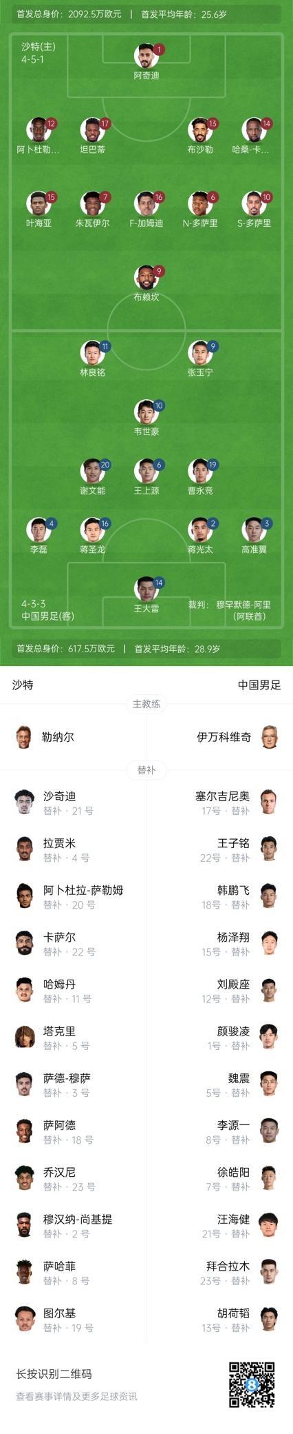 3月21日訊 世預(yù)賽亞洲區(qū)第三階段C組第7輪,中國(guó)男足客場(chǎng)挑戰(zhàn)沙特,賽前首發(fā)名單公布。