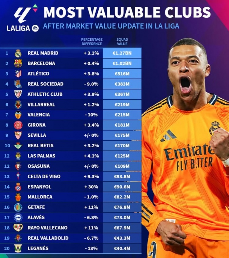 西甲最新球隊身價榜:歐元