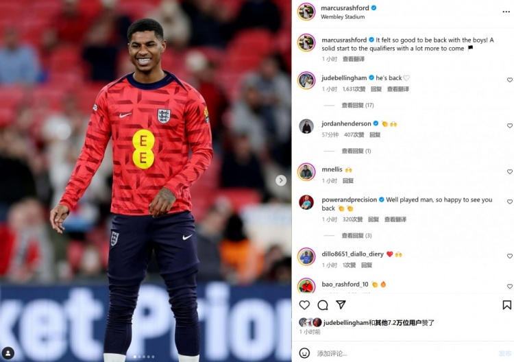 本場比賽拉什福德首發(fā)上陣,賽后他也在個人社媒曬出笑容滿面的訓練照,配文寫道:“重回球隊并與這些隊友重聚感覺太棒了,為世預賽奠定堅實的基礎(chǔ),后面還有更多挑戰(zhàn)!”