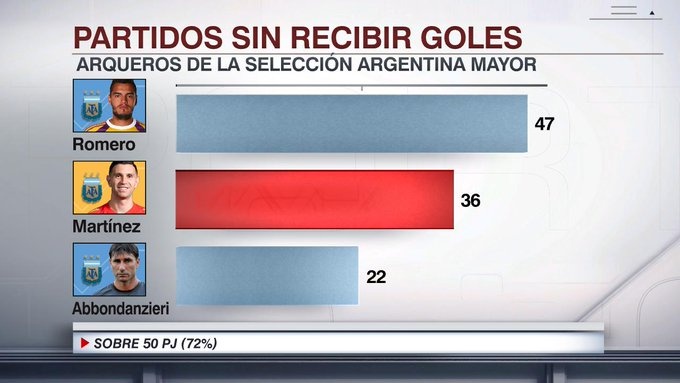 統(tǒng)計表明,馬丁內(nèi)斯已經(jīng)36次為阿根廷零封對手,排名第二,僅次47次的羅梅羅。