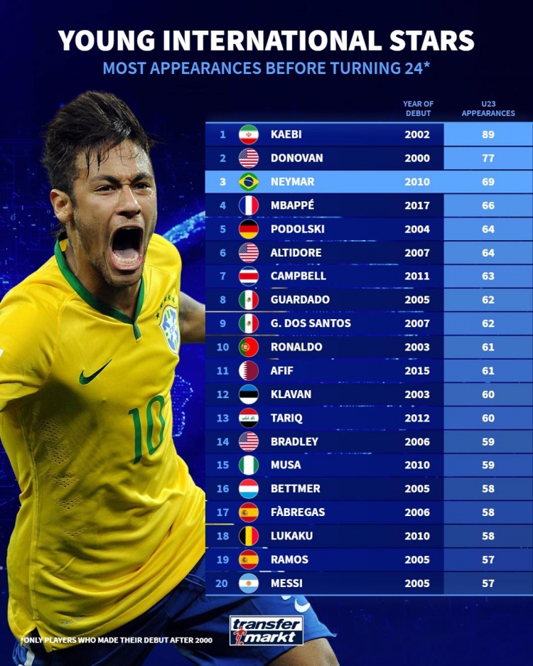 3月23日訊 德國轉(zhuǎn)會市場統(tǒng)計球員24歲之前在國家隊的出場次數(shù),并列出榜單,內(nèi)馬爾69場排名第三位,C羅61場,梅西57場。