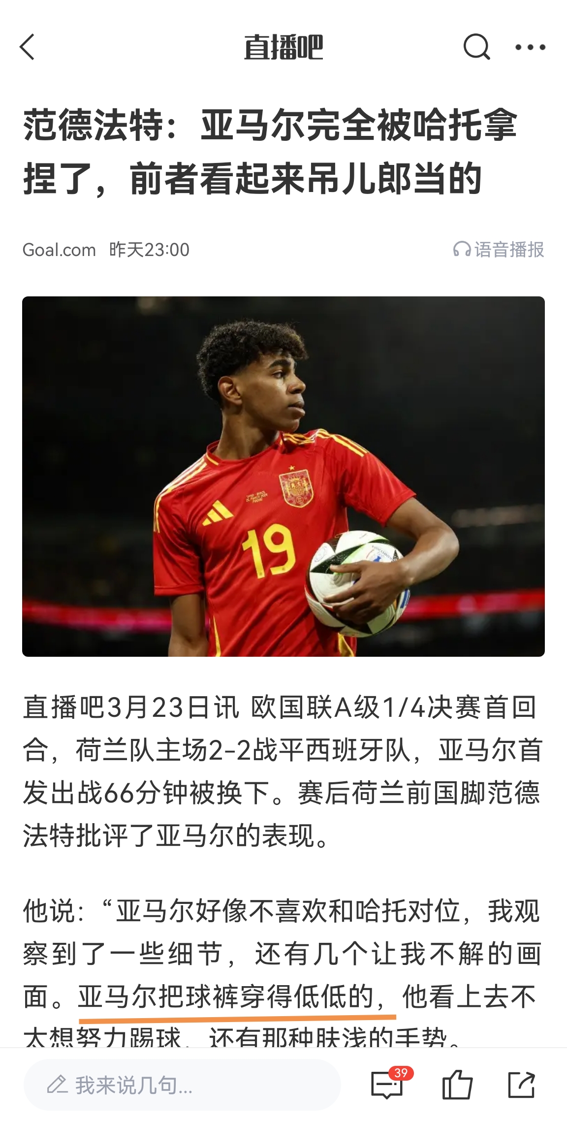 亞馬爾的這一動作顯然是有意為之。就在這場比賽前,荷蘭名宿范德法特批評了亞馬爾在首回合的表現,甚至認為亞馬爾“亞馬爾把球褲穿得低低的,他看上去不太想努力踢球,還有那種膚淺的手勢”。