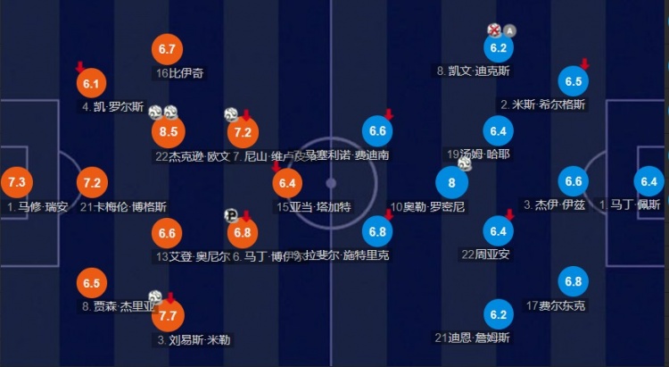 澳大利亞玩的就是效率,控球率、進攻三區(qū)進入次數(shù)比印尼還少,可比分卻是大勝(藍色方為印尼)