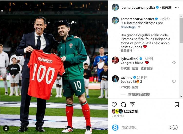 此役是B席為葡萄牙隊出戰(zhàn)的第100場比賽,因此獲贈紀念球衣。他在社交媒體上曬出照片,并寫道:“為葡萄牙國家隊出戰(zhàn)100場比賽,我感到非常自豪和高興!我們進入了四強,感謝所有葡萄牙球迷在兩回合比賽中的支持?!?/p>