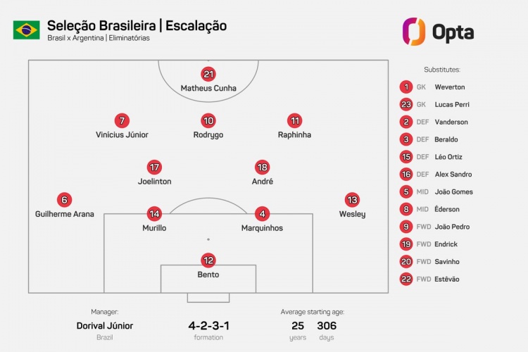 巴西公布了此役的首發(fā)陣容,Opta指出,巴西隊(duì)先發(fā)陣容中超過一半的球員在國(guó)家隊(duì)的首發(fā)次數(shù)不超過5次,分別是安德烈(5)、庫(kù)尼亞(3)、本托(2)、喬林頓(2)、穆里略(0)、韋斯利(0)。