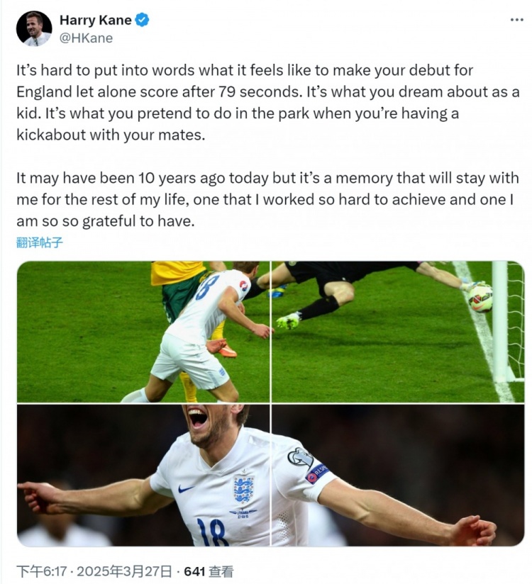 3月27日訊 凱恩更新社媒動態(tài),紀(jì)念自己上演英格蘭隊首秀10周年。