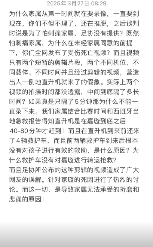 為什么家屬從第一時(shí)間就在要錄像,一直要到現(xiàn)在,你們不但不理了,還在推脫,之后談判時(shí)說是為了怕刺痛家屬,足協(xié)沒有提供?既然怕刺痛家屬,為什么在未經(jīng)家屬同意的前提下,你們?nèi)W(wǎng)發(fā)布了受傷死亡視頻?而且視頻只有兩個(gè)短暫的剪輯片段,兩個(gè)不同機(jī)位、不同載體、不同時(shí)間并且經(jīng)過剪輯的視頻,營造出人一倒地直升機(jī)就來了的假象。實(shí)際上兩個(gè)視頻的拍攝時(shí)間都沒透露,中間到底隔了多長時(shí)間?如果真是只隔了5分鐘那為什么不能一直錄下來。
