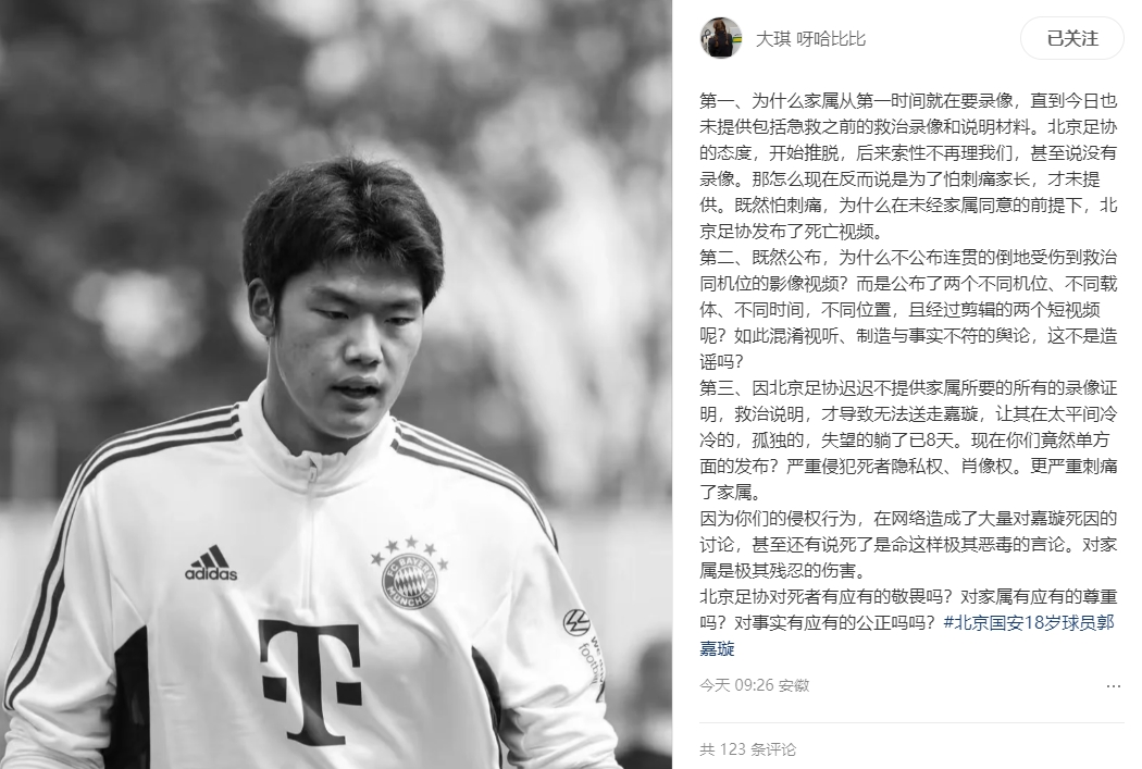 第一、為什么家屬從第一時(shí)間就在要錄像,直到今日也未提供包括急救之前的救治錄像和說明材料。北京足協(xié)的態(tài)度,開始推脫,后來索性不再理我們,甚至說沒有錄像。那怎么現(xiàn)在反而說是為了怕刺痛家長,才未提供。既然怕刺痛,為什么在未經(jīng)家屬同意的前提下,北京足協(xié)發(fā)布了死亡視頻。