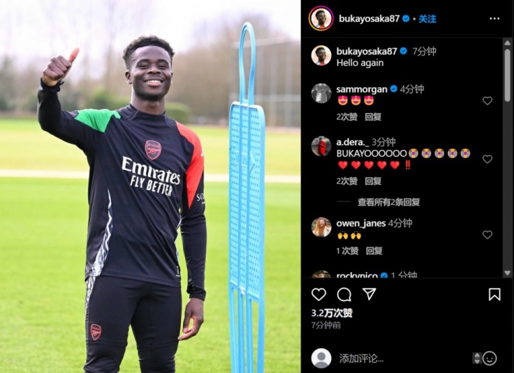 3月28日訊 阿森納邊鋒薩卡更新社媒,曬出自己身穿訓(xùn)練服照片,配文:又見(jiàn)面了。