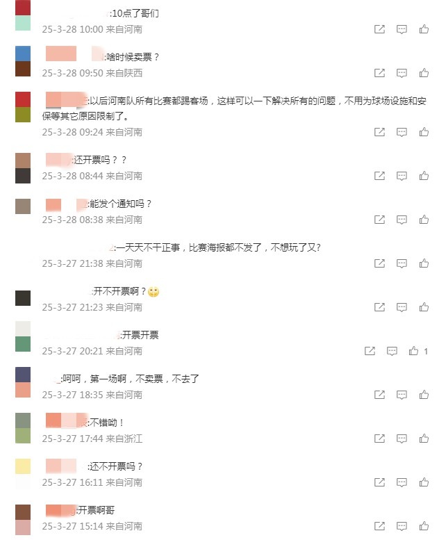 根據(jù)賽程安排,河南隊將在本輪聯(lián)賽主場對陣上海申花,比賽時間為3月29日(星期六)18:00。在賽前僅剩一天的時候,俱樂部仍未售票,也沒有相關(guān)公告,這讓球迷等得非常急迫。在河南隊官方微博的評論區(qū),球迷們在持續(xù)催促售票。