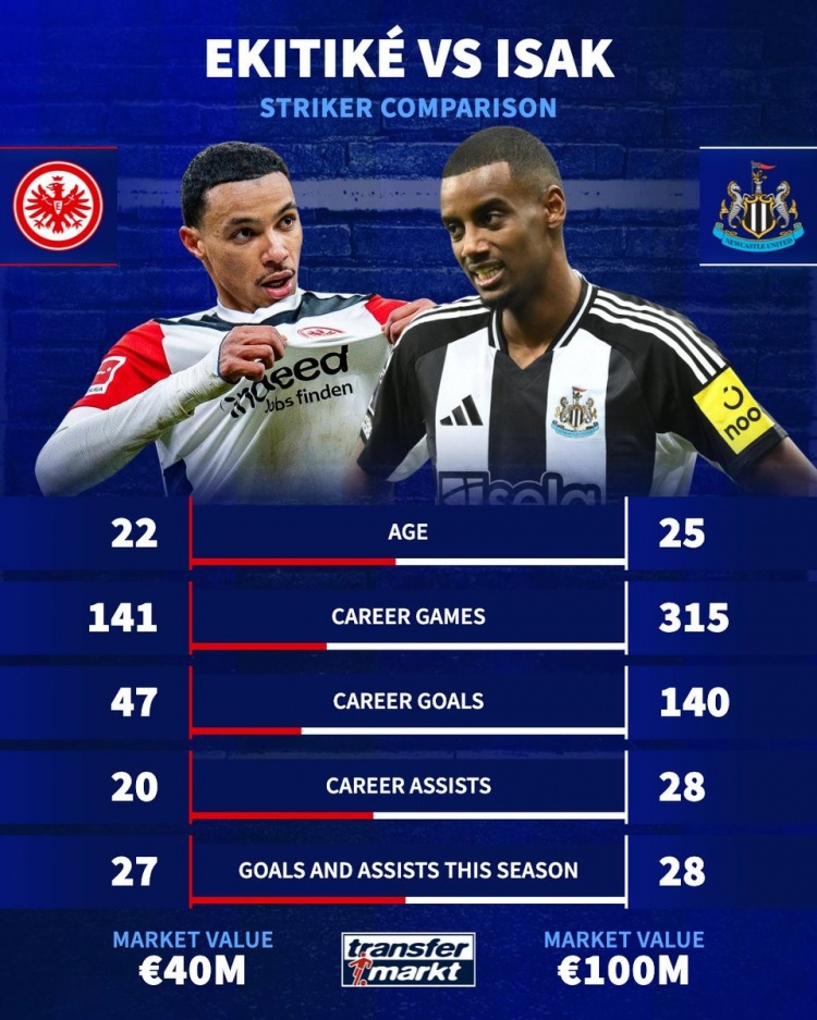 伊薩克(紐卡斯爾,25歲):生涯315場140球28助攻,本賽季直接參與28球,德轉(zhuǎn)身價1億歐元