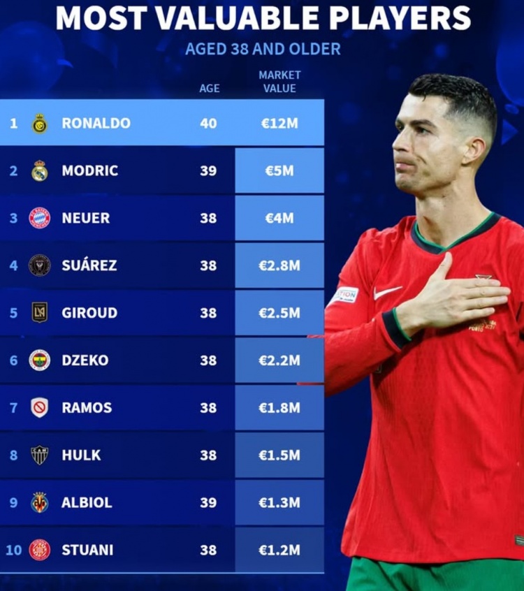 2月6日訊 《轉(zhuǎn)會(huì)市場(chǎng)》統(tǒng)計(jì)了38歲及以上球員身價(jià)榜,40歲的C羅居首。