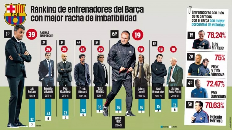 3月29日訊 巴薩在西甲補賽3-0完勝奧薩蘇納,延續(xù)了弗里克帶隊的出色表現(xiàn),《每體》統(tǒng)計顯示弗里克是巴薩隊史主帥連續(xù)不敗榜第6,并且總勝率僅次于恩里克。