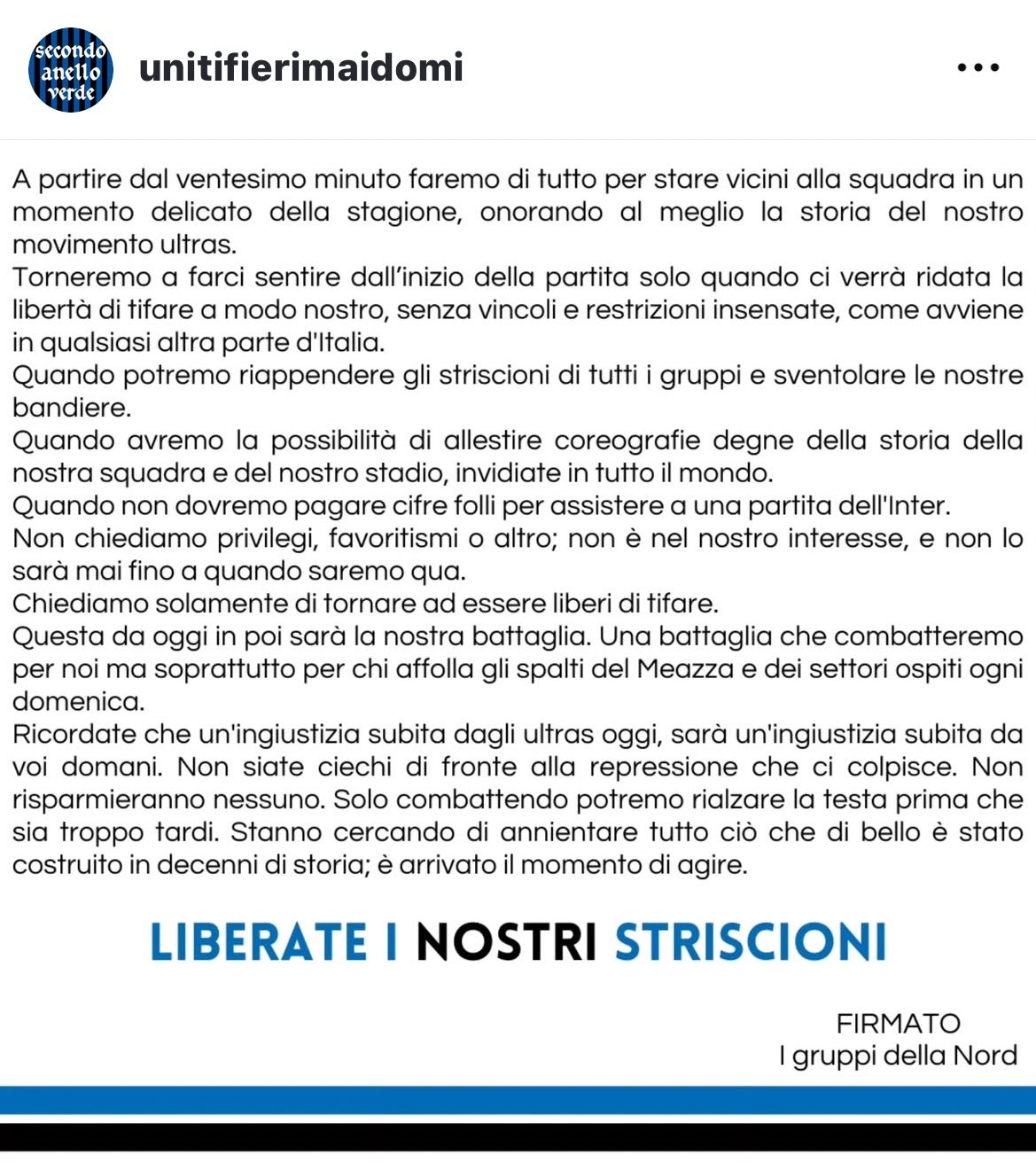 只有當(dāng)我們重新獲得以自己的方式歡呼的自由時(shí),我們才會(huì)重新讓自己的聲音響起。不受毫無(wú)意義的約束和限制,就像在意大利的任何其他球場(chǎng)發(fā)生的那樣。
