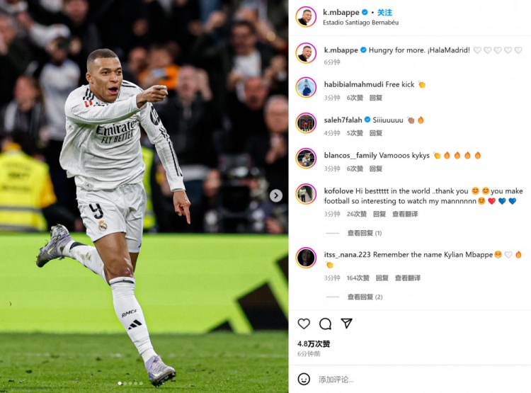 姆巴佩在賽后同社媒曬出自己進球后的慶祝照并配文:“渴望贏得更多!馬德里前進!”