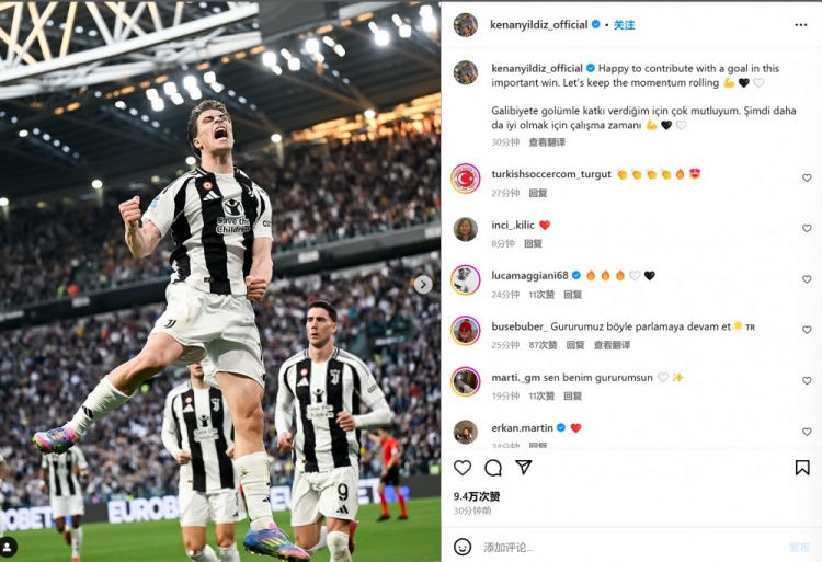 3月30日訊 尤文在本輪意甲1-0擊敗熱那亞,圖多爾取得執(zhí)教后首勝,打進制勝球的伊爾迪茲也通過社媒曬照慶祝。