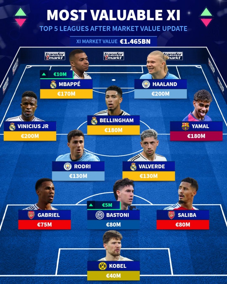 3月31日訊 德國(guó)轉(zhuǎn)會(huì)市場(chǎng)更新了五大聯(lián)賽球員的身價(jià),并列出身價(jià)最高陣容,哈蘭德、姆巴佩、維尼修斯、貝林厄姆、亞馬爾在列。