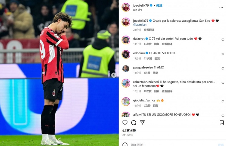 他也在賽后通過社媒曬出自己進球后的慶祝照,并配文:“謝謝你們的熱烈歡迎,圣西羅??????@AC米蘭俱樂部”。