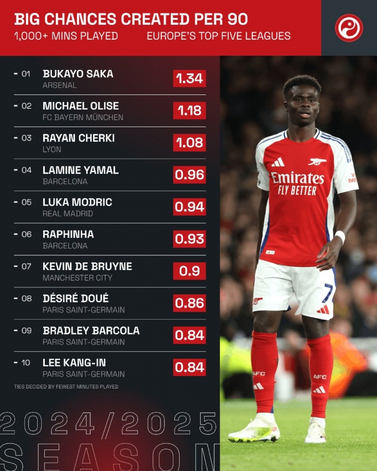 4月1日訊 Squawka統(tǒng)計了本賽季五大聯(lián)賽球員每90分鐘創(chuàng)造重大機會的次數(shù),薩卡1.34次居首,奧利塞1.18次第二。
