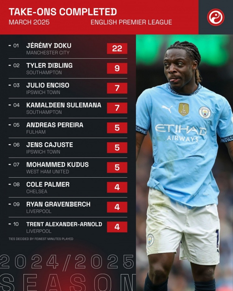 4月1日訊 Squawka統(tǒng)計(jì)了英超3月份球員的成功過(guò)人數(shù)據(jù),并列出榜單,曼城邊鋒多庫(kù)22次斷層居首,迪布林9次第二。值得一提的是,多庫(kù)的過(guò)人次數(shù)在英超球隊(duì)中也能排在第三位,僅次于曼城和南安普頓。