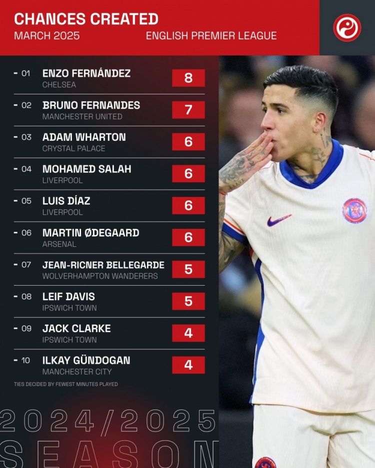 4月1日訊 Squawka統(tǒng)計(jì)了3月份球員在英超創(chuàng)造機(jī)會(huì)的次數(shù),并列出榜單,恩佐8次居首,B費(fèi)7次第二。