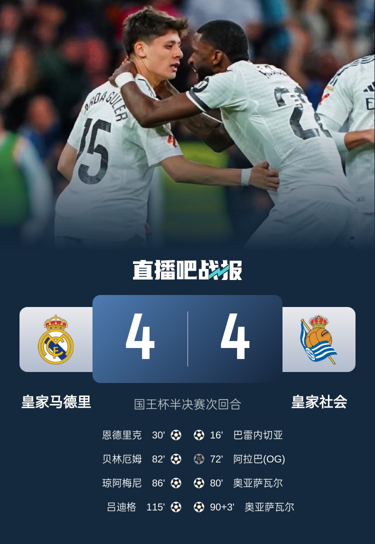 皇馬4-4總比分5-4皇社,加時(shí)絕殺晉級國王杯決賽,呂迪格打入制勝一球!皇馬將戰(zhàn)巴薩和馬競之間的勝者。