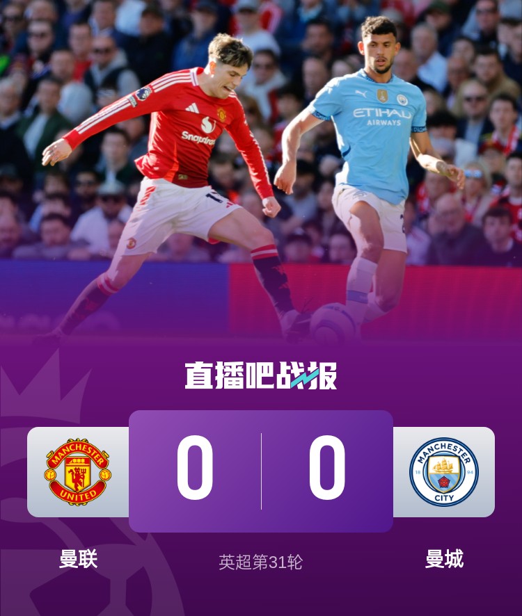 04月07日訊 英超第31輪,曼聯(lián)0-0戰(zhàn)平曼城,曼市德比4場(chǎng)不敗。