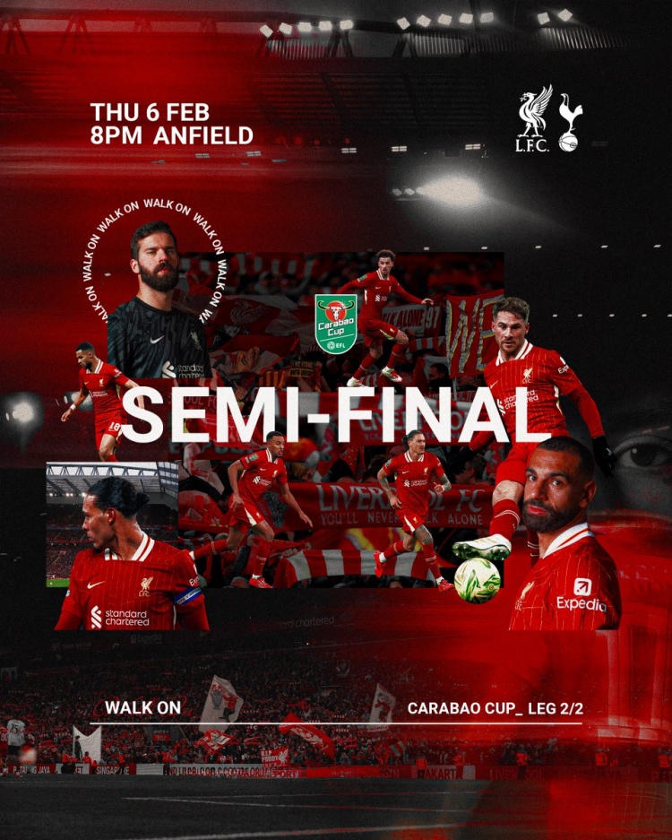利物浦社媒發(fā)布為此役制作的海報(bào)并配文:聯(lián)賽杯半決賽將在安菲爾德進(jìn)行。