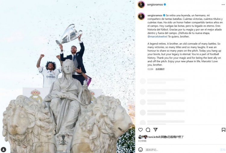 拉莫斯:“一位傳奇退役了,你是我的一個(gè)兄弟,一位多年并肩戰(zhàn)斗的老戰(zhàn)友。我們一起贏得過(guò)那么多的勝利,那么多的冠軍,那么多的歡樂(lè),能在球場(chǎng)上和你共事這么多年是我的榮幸。
