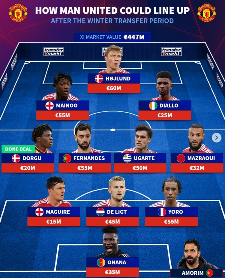 2月7日訊 五大聯(lián)賽冬窗已經(jīng)結(jié)束,《轉(zhuǎn)會市場》也根據(jù)補強預測了曼聯(lián)的主力陣容。