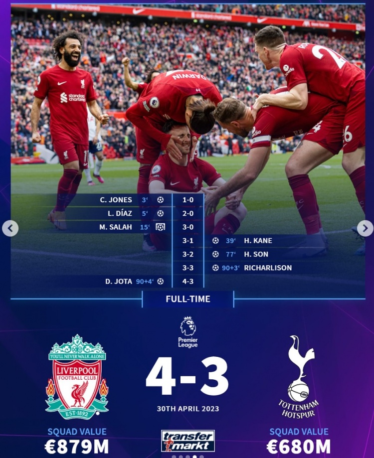 2023年4月,英超:利物浦4-3熱刺。瓊斯、路易斯-迪亞斯、薩拉赫上半場連入三球,凱恩、孫興慜連扳兩球,理查利森第93分鐘“絕平”,若塔第94分鐘絕殺。