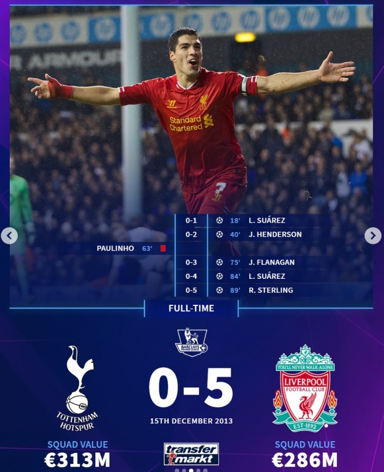 2013年12月,英超:熱刺0-5利物浦。蘇亞雷斯貢獻(xiàn)2球2助攻,并制造保利尼奧染紅,亨德森傳射建功,紅軍客場取得大勝。