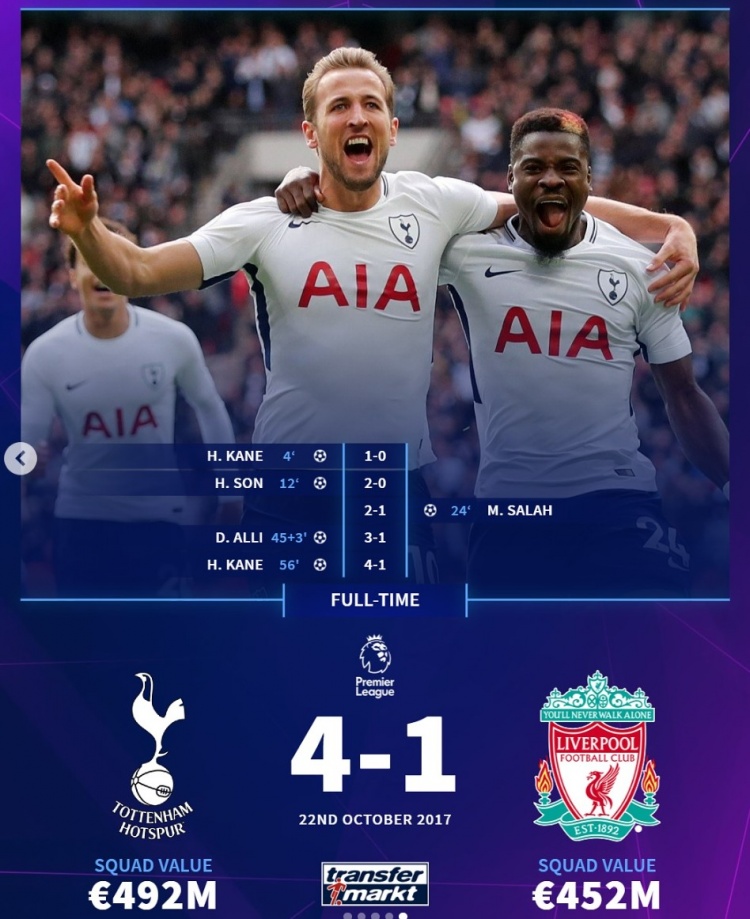 2017年10月,英超:熱刺主場4-1利物浦。孫凱上半場各進(jìn)一球,薩拉赫扳回一城,阿里上半場補時破門,凱恩下半場再進(jìn)一球鎖定勝局。