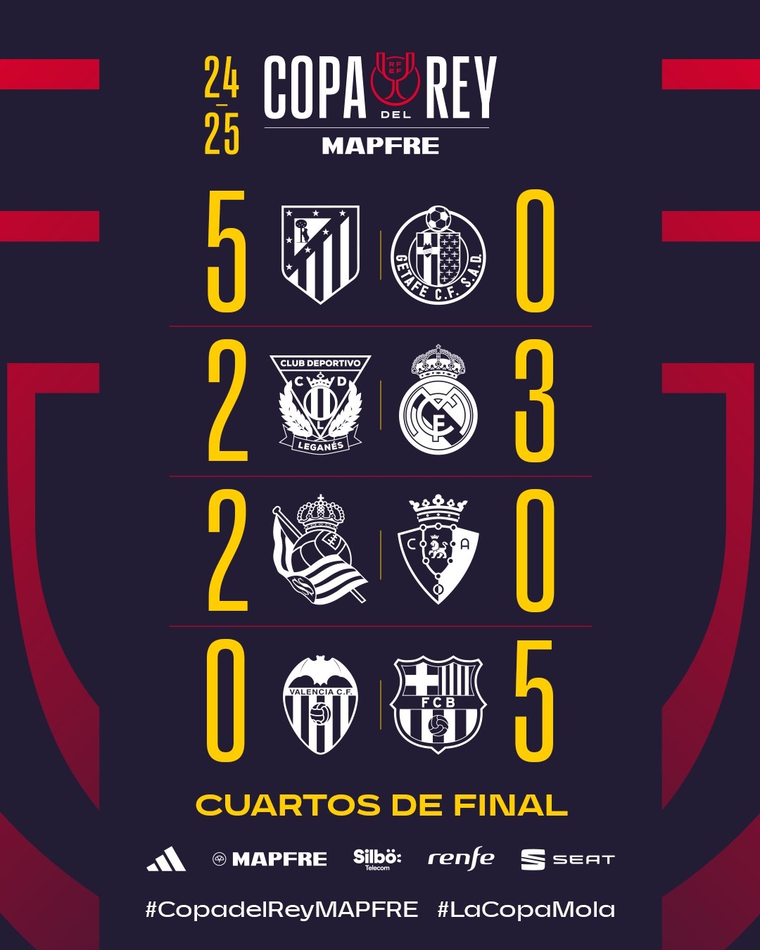02月07日訊 今日凌晨國王杯8強(qiáng)賽,巴薩5-0大勝瓦倫西亞,與皇馬、馬競、皇社共同晉級(jí)4強(qiáng)。