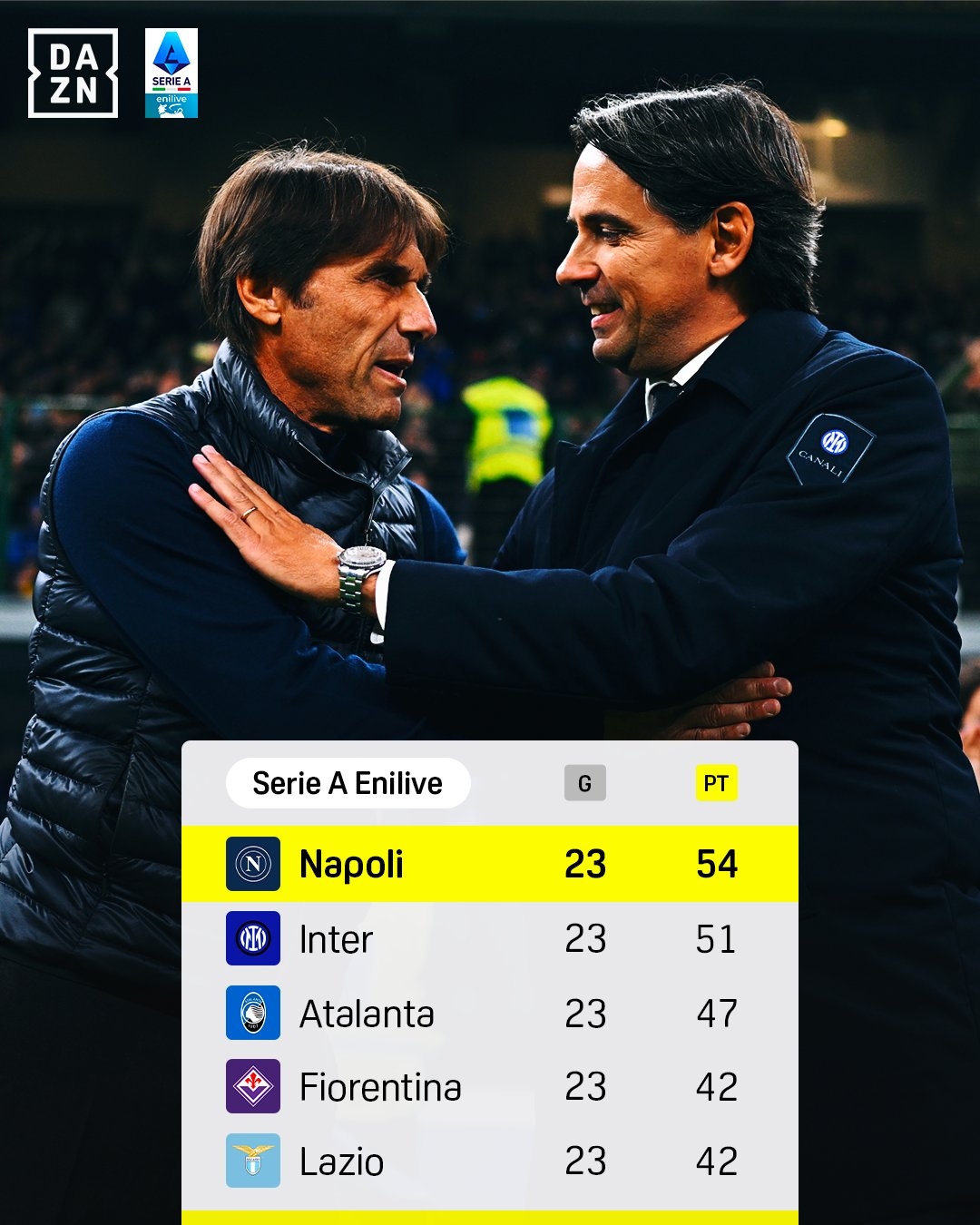 本賽季的意甲打完23輪,爭冠形勢漸漸清晰:孔蒂帶隊的那不勒斯,與衛(wèi)冕冠軍小因扎吉的國米是最被看好的兩隊。此前一度排在榜首的亞特蘭大近期6輪僅1勝,后勁不足漸漸掉隊。