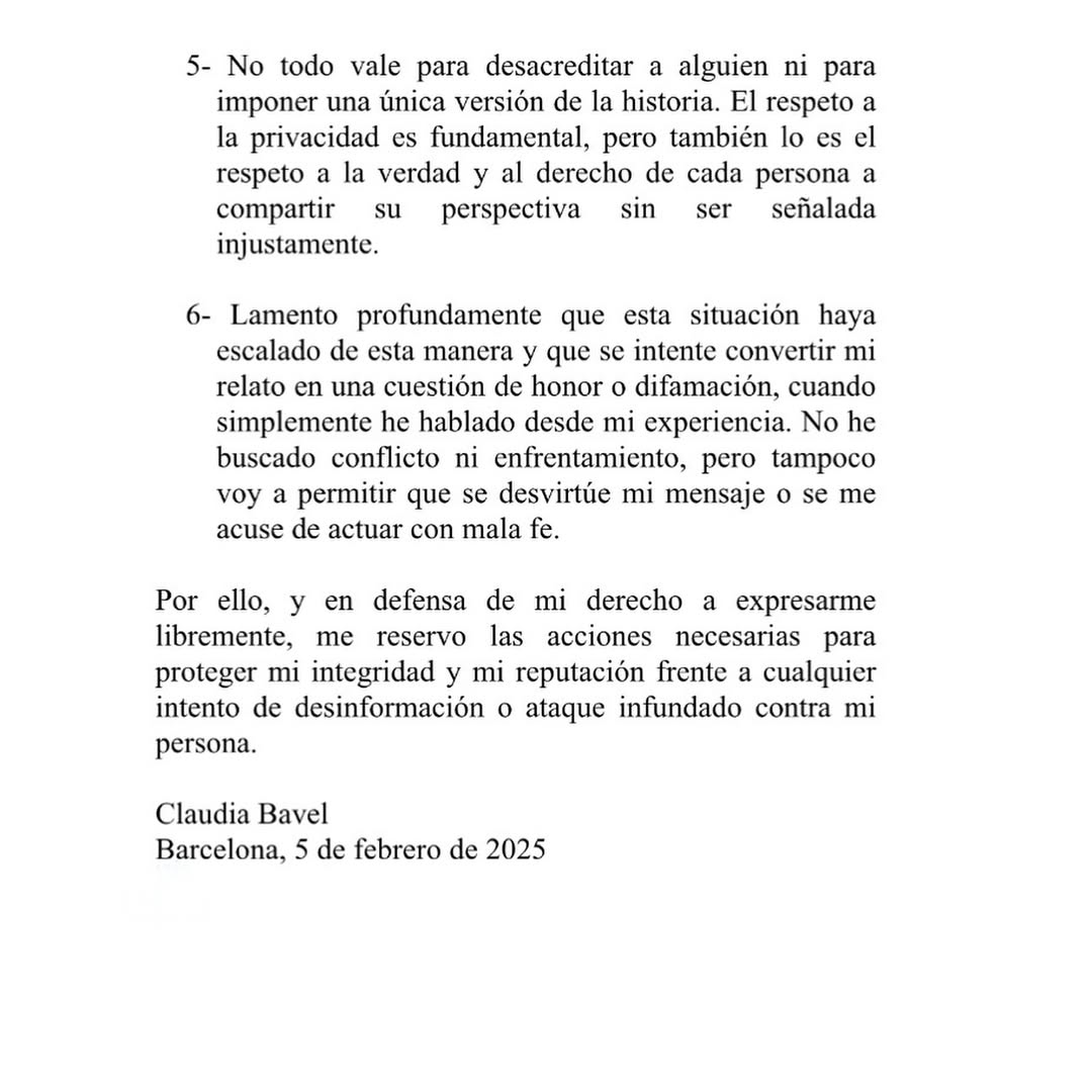 克勞迪婭-巴維爾隨后也給出了自己的回應,她表示:“鑒于最近的事件和公開聲明,我覺得有必要表達以下觀點。和任何人一樣,我有權分享我的經歷,而不意味著侵犯他人的隱私。我一直對我的社區(qū)和關注我的人保持透明,從未試圖用我的言辭傷害任何人?!?/p>