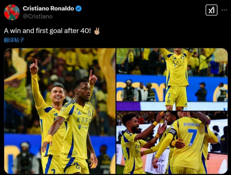C羅也在賽后通過社媒曬出自己的慶祝照,并配文:“一場勝利,以及40歲后的第一粒進球。”