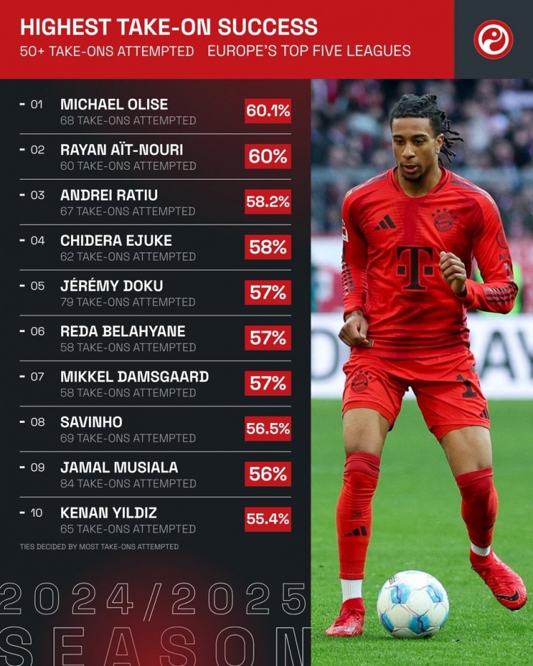 2月8日訊 squawka統(tǒng)計(jì)了本賽季五大聯(lián)賽過人成功率情況,奧利塞居首,而五大聯(lián)賽成功過人次數(shù)最多的亞馬爾并未進(jìn)入前十。