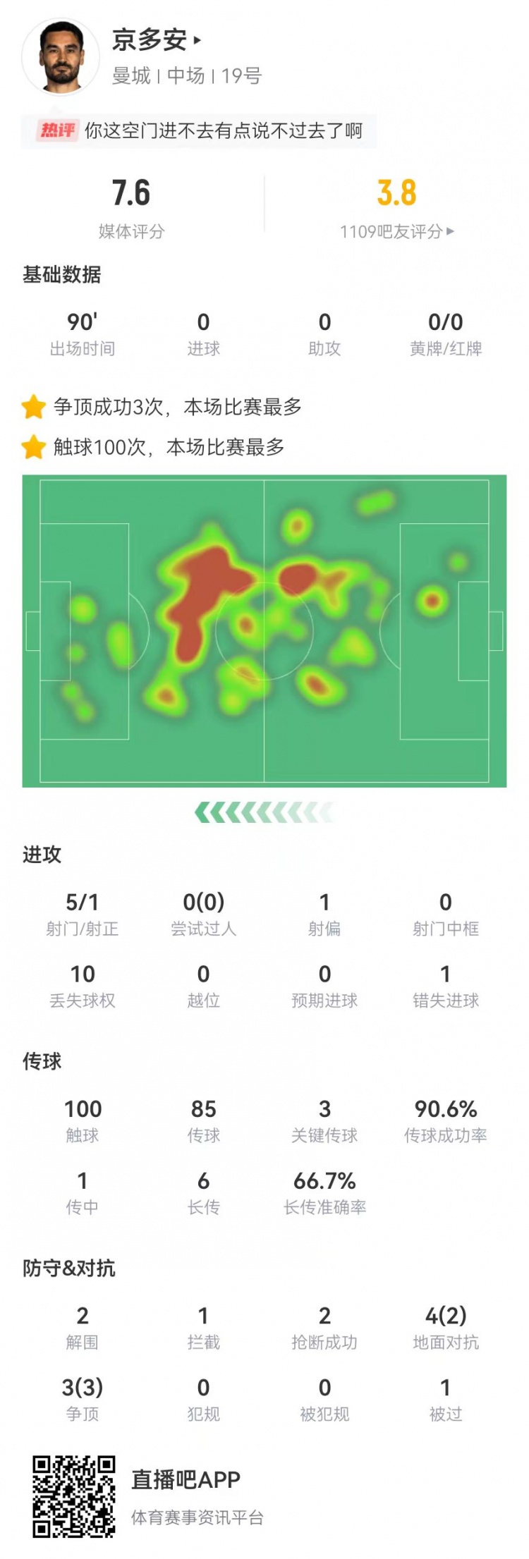 2月8日訊 曼城在本輪足總杯2-1險(xiǎn)勝萊頓東方,京多安本場數(shù)據(jù)如下: