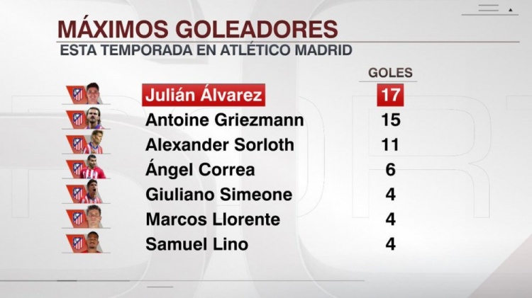 2月9日訊 西甲第23輪比賽,阿爾瓦雷斯點射破門,幫助馬競客場1-1戰(zhàn)平皇馬。ESPN統(tǒng)計了馬競球員本賽季的進球數(shù)量,阿爾瓦雷斯17球最多。