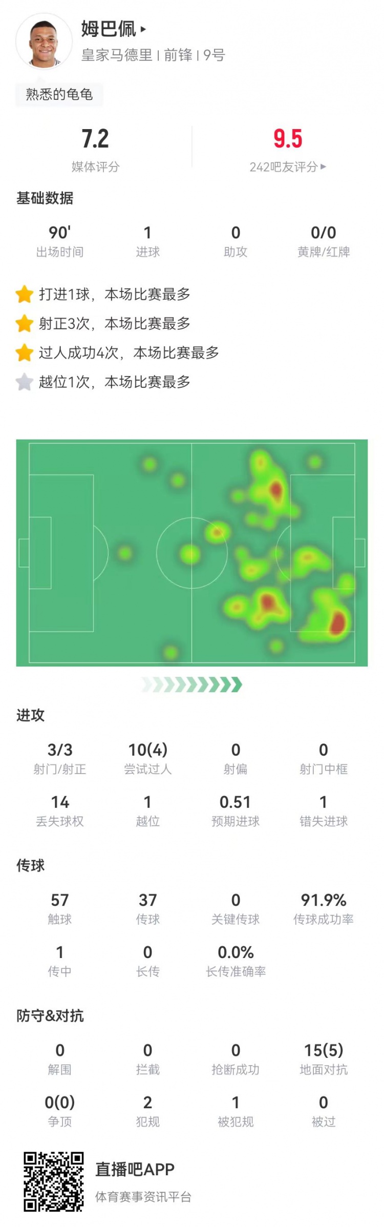 2月9日訊 皇馬在本輪西甲焦點(diǎn)戰(zhàn)1-1戰(zhàn)平馬競(jìng),姆巴佩本場(chǎng)數(shù)據(jù)如下: