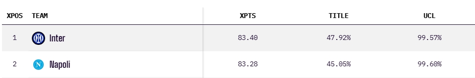 機(jī)構(gòu)演算數(shù)據(jù)顯示,國米本賽季意甲奪冠概率為47.9%,比目前排名榜首的那不勒斯高出近3個(gè)百分點(diǎn),那不勒斯奪冠概率為45%,機(jī)構(gòu)預(yù)測兩隊(duì)季末都是83個(gè)積分收官。