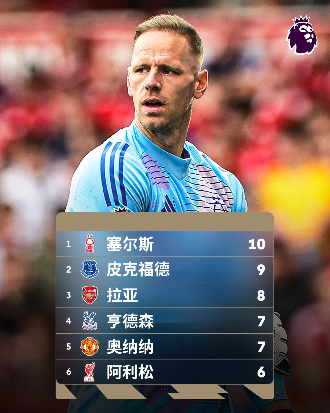 誰能想到?英超金手套獎爭奪形勢:森林門將賽爾斯10次零封領跑